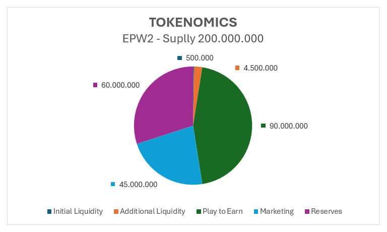 <table><thead><tr><th width="208">Destination of Tokens</th><th width="166">Starting Percentage</th><th width="169">EPW2 Supply</th></tr></thead><tbody><tr><td>Initial Liquidity</td><td>0,25%</td><td>500,000</td></tr><tr><td>Additional Liquidity</td><td>2,25%</td><td>4,500,000</td></tr><tr><td>Play to Earn</td><td>45,00%</td><td>90,000,000</td></tr><tr><td>Marketing</td><td>22,50%</td><td>45,000,000</td></tr><tr><td>Reserves</td><td>30,00%</td><td>60,000,000</td></tr><tr><td><strong>Total</strong></td><td><strong>100,00%</strong></td><td><strong>200,000,000</strong></td></tr></tbody></table>